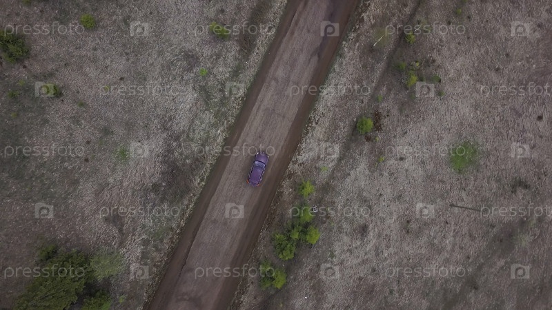 Вид с воздуха на сельскую дорогу посреди зеленых бесконечных лугов. Клип. Вид сверху поля и узкой дороги с движущейся машиной