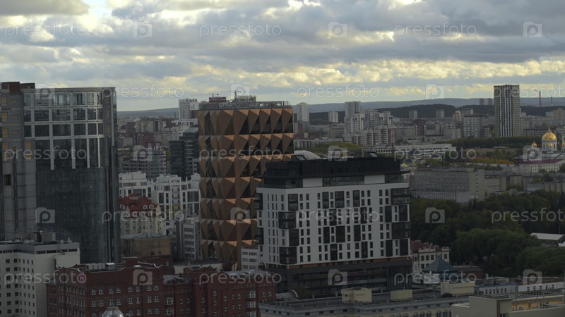 Вид сверху на современные здания и фасады города. Скриншоты. Прекрасный вид на город между современными многоэтажками. Красивые здания современного города со зеленым ландшафтом на фоне