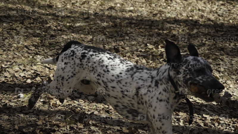 Игровой далматинец исследует красочный лес в приключениях