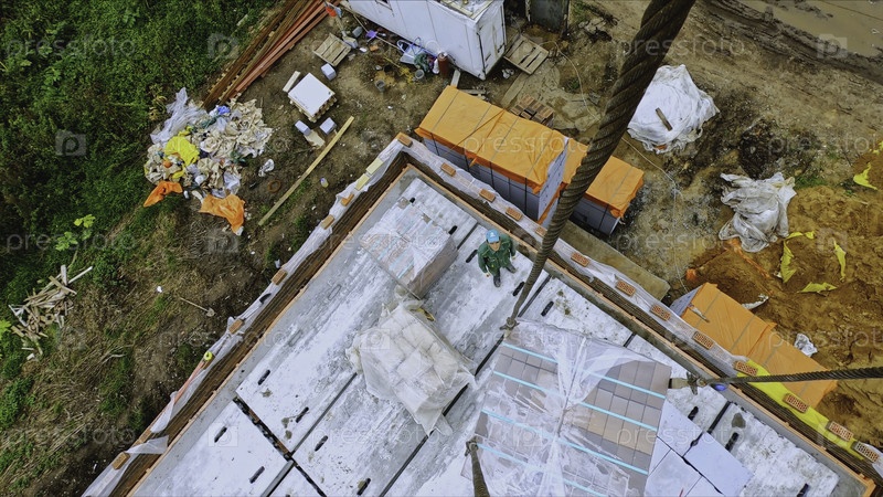 Временное замедление перемещения кирпича с крана. Клип. Рабочие загружают кирпичи на строительный кран для переноса. Камера на кране для транспортировки тяжелых кирпичей на стройплощадке