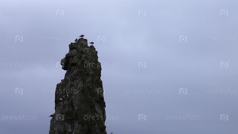 На вершине длинной скалы с чайками.Клип.Чайки сидят на вершине скалы на фоне облачного неба.Чайки летают и сидят на небольшом камне в море в пасмурную погоду