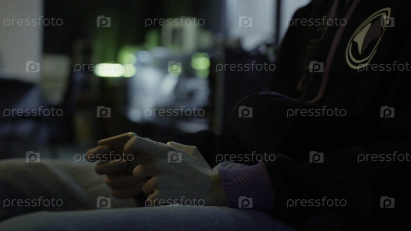 Близкий план подростка-мужчины в капюшоне, сидящего на диване с телефоном в руках