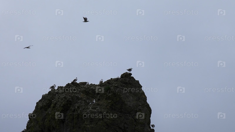 Красивое стадо чайков на скале на фоне облачного неба. Стадо чайков летает у скалы в пасмурную погоду