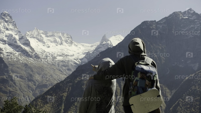Альпы холодные горные вершины, покрытые снегом и льдом.Креативный взгляд сзади на пару туристов, наблюдающих за спокойной природой зимой