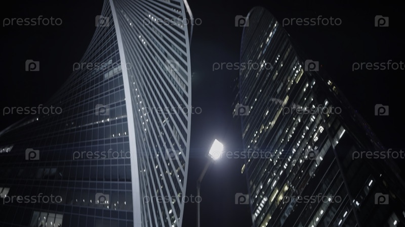 Небоскребы поднимаются на городской улице ночью.Действие.Современные высотные здания со стеклянным фасадом