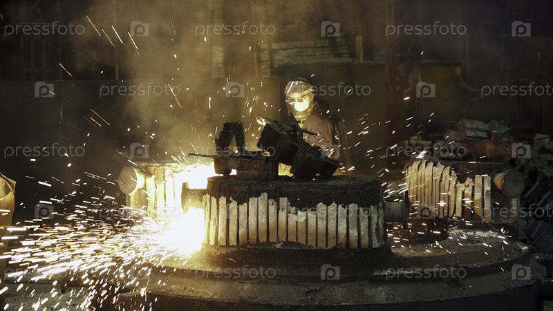 Высокоинтенсивная промышленная сцена демонстрирует квалифицированную металлообработку с яркими искрами и дымом вокруг