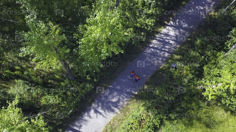Солнечный вид с вертолета.Клип.Молодые люди в рабочих униформах гуляют по парку, чтобы закончить строительный объект
