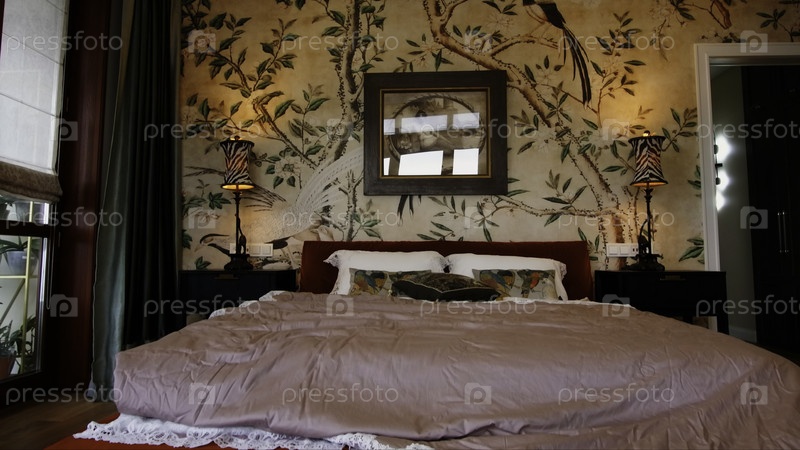 Кровать в спальне со стенами с украшением природы.Креативно.Декоративные стены с ветвями деревьев и птицами