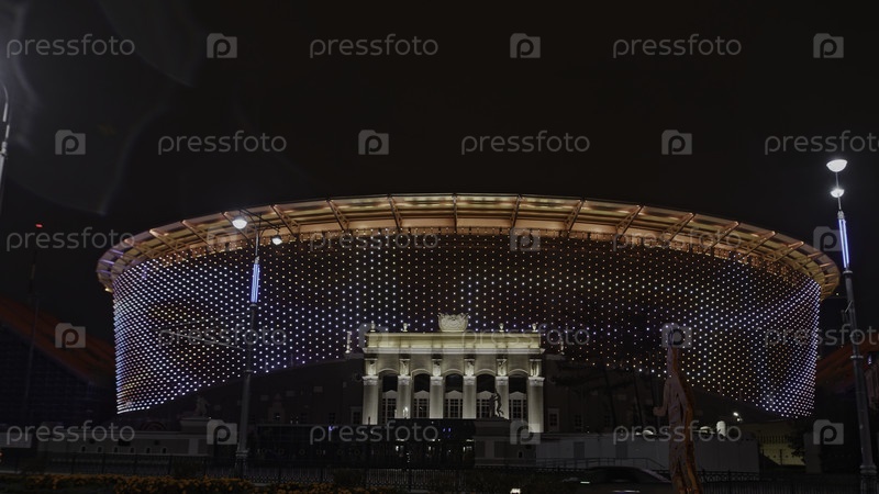 Ночной вид светящихся прожекторов на круглой спортивной арене. Скриншоты. Концепция современной архитектуры