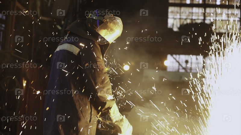 Усердный работник непрерывно генерирует яркие искры, выполняя сложную металлическую обработку на фабрике