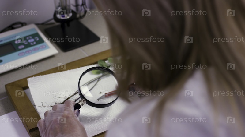В лабораторных условиях специализированный исследователь тщательно анализирует образцы растений с помощью лупы