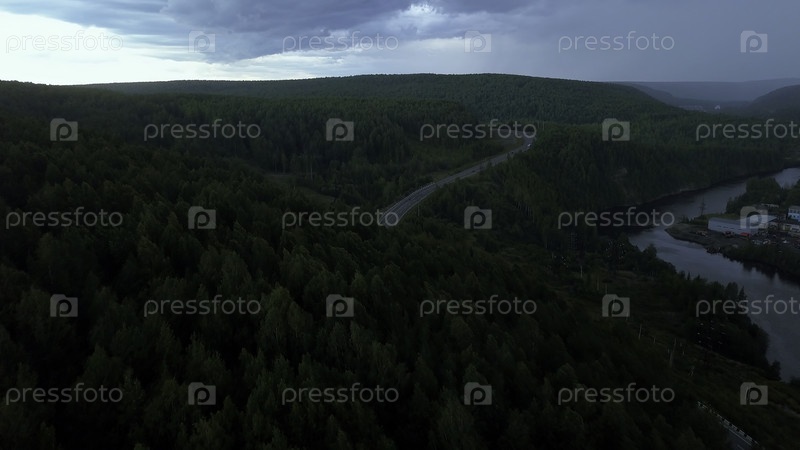 Вид с воздуха на реку и лес в летний день, небо и облака. Клип. Летающий над волнистыми берегами рек и зелеными лесами, красивое место с природным ландшафтом