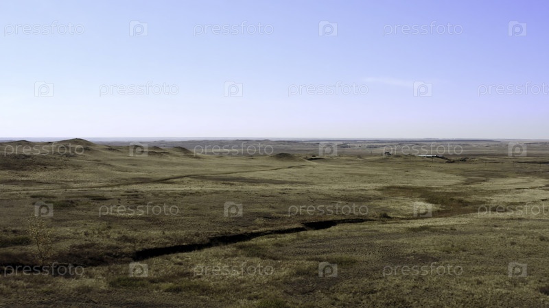 Спокойный и спокойный вид на обширную прерию, простирающуюся бесконечно под ярким голубым небом