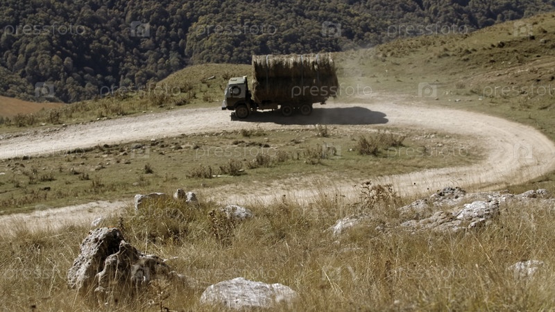 Автомобиль, загруженный стоками сена, проезжает через сельскую местность.Креативно.Солнечный день и долина с растущей травой