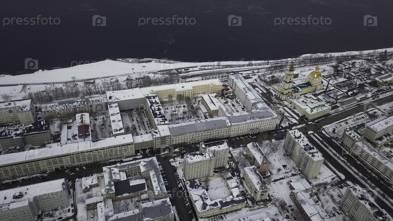 Вид с воздуха зимнего города, расположенного у побережья темно-синего моря. Клип. Типичный городской фон