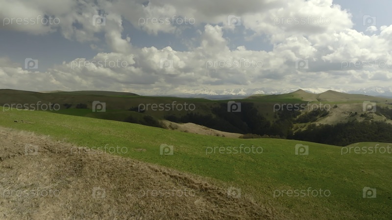 Горный ландшафт с зеленой травой и редкими деревьями. Снимок. Вид сверху на красивую холмистую долину со зеленой травой и облачным небом. Летний пейзаж горной долины с редкими деревьями и зеленой травой