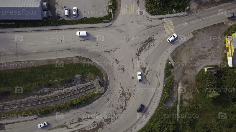 Вид с высоты. Клип. Небольшая вилка на дороге автомобилей с быстро движущимися транспортными средствами. Высококачественная запись 4k