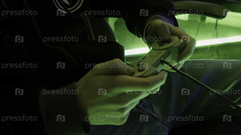 США - Нью-Йорк, 15 апреля 2023 года: Ближайшее изображение мужской руки геймера, держащей джойстик для консоли. Фрагмент кадров. Молодой игрок сидит на диване в гостиной с неоновым зеленым освещением