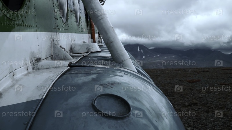Ближайшее изображение старого ржавого самолета на вершине холма. Клип. Детали экстерьера самолета с тяжелыми облаками и горами на заднем плане