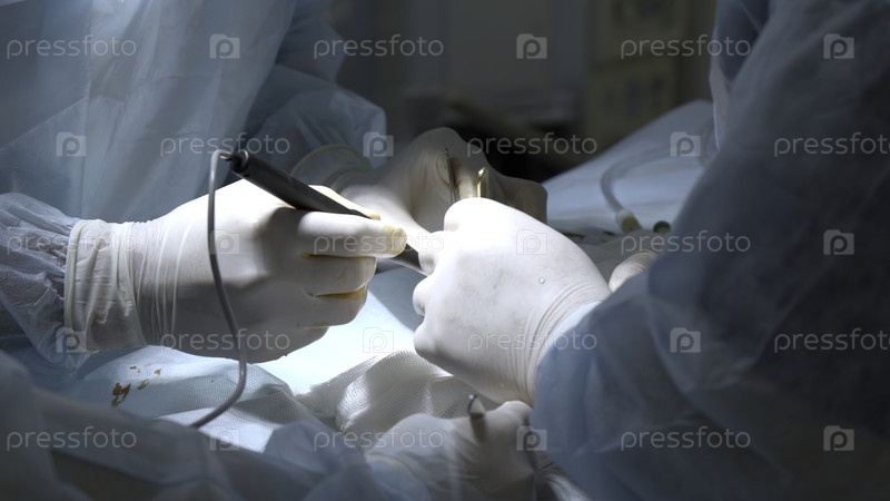 Опытные хирурги в белых перчатках, выполняющие манипуляции с телом пациента при ярком свете