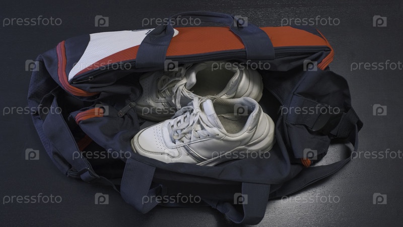 Спортсмен кладет кроссовки в спортивную сумку. Клип. Близкий план человека, кладящего кроссовки в сумку. Упаковка спортивного пакета для тренировок