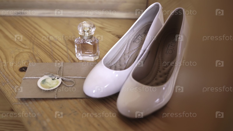 В видео демонстрируется стильный деревянный стол с белыми обувью и элегантной бутылкой парфюмерии, вызывающей современную моду и красоту