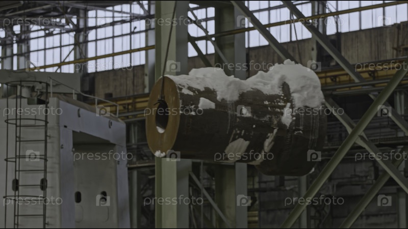 Часть перемещается на кабелях на заводе. Скотч-клип. Большая часть с снегом толкается внутрь фабрики. Кран, перевозящий часть в промышленном предприятии