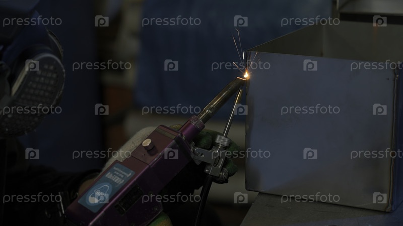 Сварка стали, технический работник, работающий на металле с помощью сварочной машины в заводе при ношении оборудования безопасности.Креативное обслуживание строительных сооружений по концепции ручного трудового мастерства