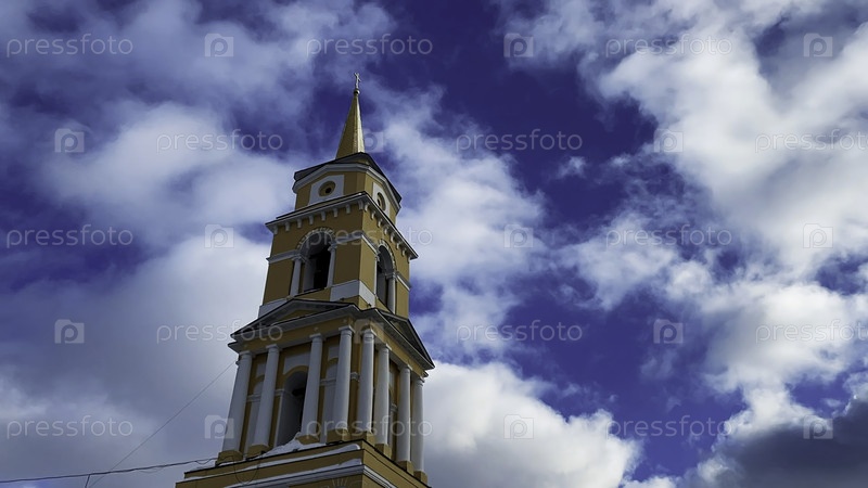 Временное затишье ускорило движение облаков в голубом небе над христианской церковью. Клип. Религиозная концепция, низкоугольный вид башни церкви