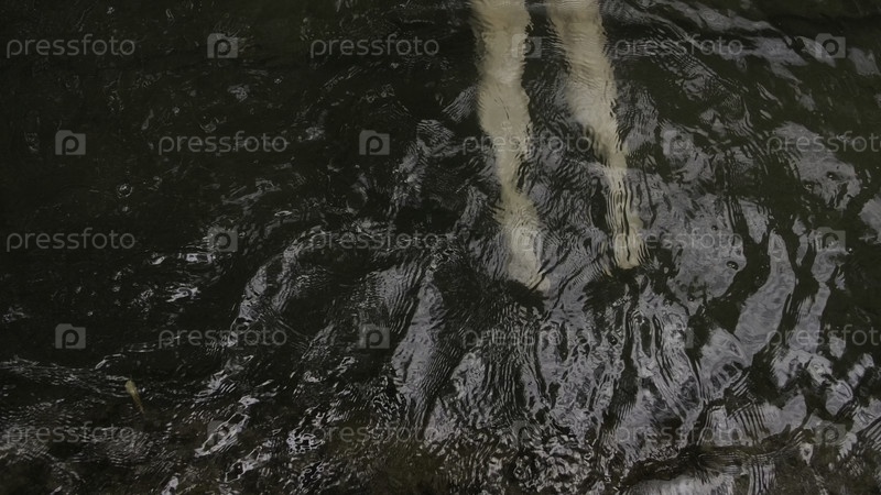 Ноги в воде с течением. креативность. замедленная съемка водяных волн со стопами под водой в пруду. ноги под водой в естественном водоеме летом в лесу
