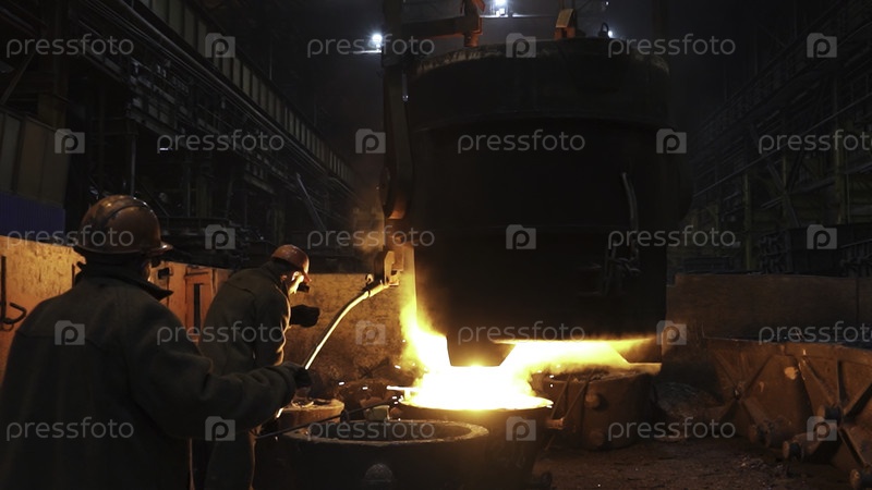 В слабо освещенной промышленной литейной среде квалифицированные рабочие усердно разливают расплавленную сталь с точностью