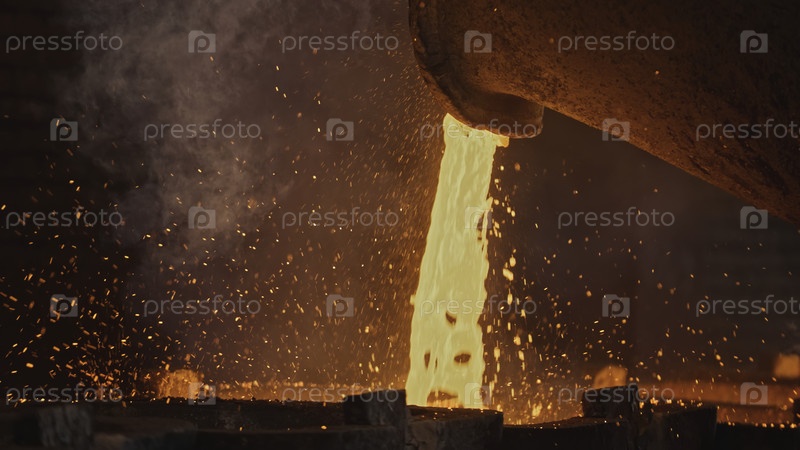 Яма наливает жидкий металл в формы. Скриншоты. Жидкая масса расплавленного металла выливается из ямы. Поток жидкого металла заливается в формы на металлургическом заводе