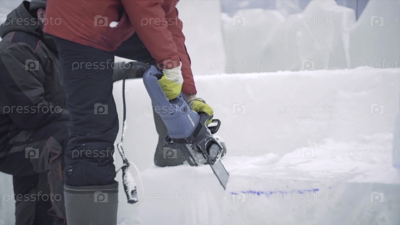 Мужчина использует бензопилу, чтобы вырезать лед в зимнюю сцену, а другие наслаждаются заснеженным катоком и готовятся к снежному ландшафту