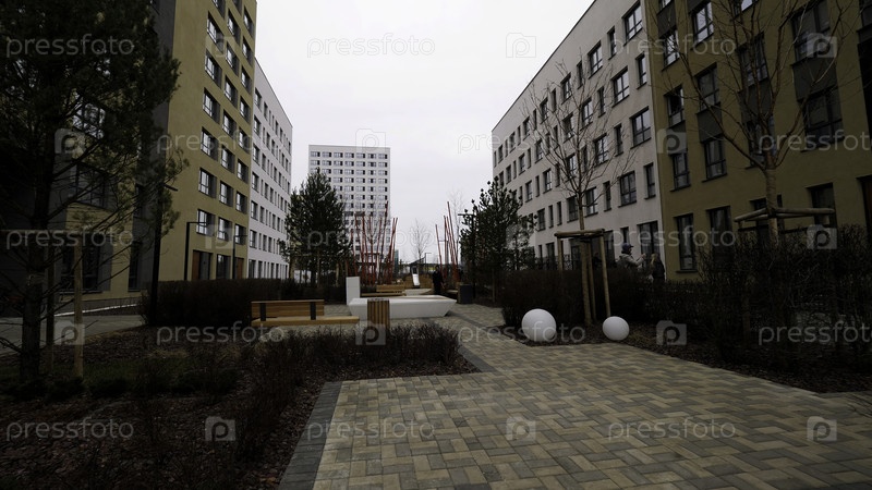 Красивый современный жилой район с недавно построенными домами, многоэтажные здания и джентрифицированная территория