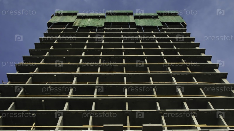 Фасад многоэтажного бетонного здания, находящегося в стадии строительства. Концепция. Вид снизу на строящееся многоэтажное здание. Бетонное здание во время строительства в солнечный день