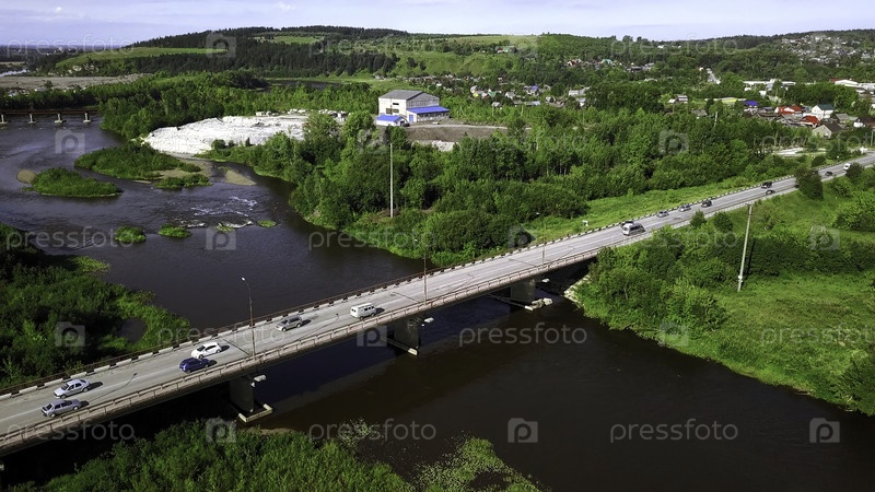 Вид с воздуха на реку и мост, где в летний день едут автомобили. Клип. Летняя деревня вокруг зеленой растительности