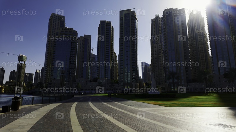 Пустая улица города в солнечный день. Действие. Каменные джунгли, красивая архитектура
