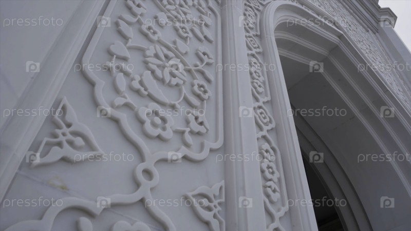 Красивые белые узоры мусульманского храма. Сцена. Близкие цветочные рельефные рисунки на белых стенах храма. Прекрасные деликатные узоры белого мусульманского храма
