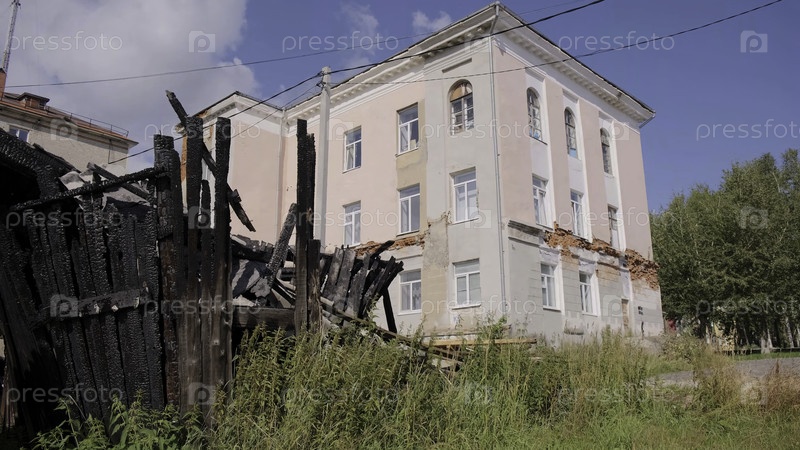 Вид на старый заброшенный дом с упавшей штукатуркой.Клип.Зеленая трава и старое сожженное деревянное здание