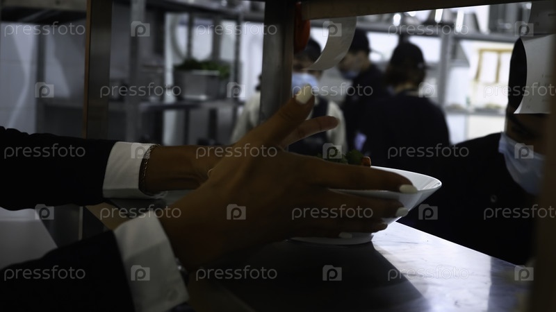 Официантка берет блюдо с кухни. HDR. Молодая женщина в маникюре берёт блюдо из кухонного отделения, чтобы отдать посетителям ресторана. Высококачественная запись 4k