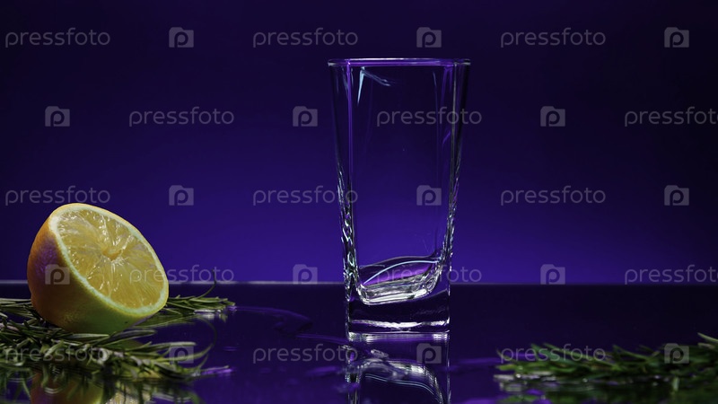 Близость к заполнению пустого бокала свежим зеленым напитком. Запасный зажигалка. Детали бара с половиной апельсина и розмарином