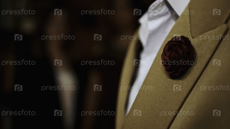 Искусственный бутоньер на куртке жениха. Скриншоты, мужчина прикасается к элементу свадебного костюма