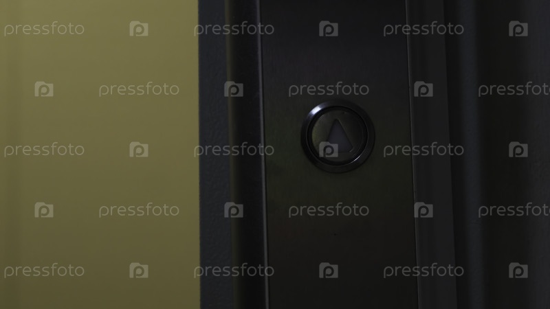 Кнопка лифта и человек Концепция Близкий план кнопки лифта с открывающимися дверями и человека Человек в лифте с кнопкой вызова