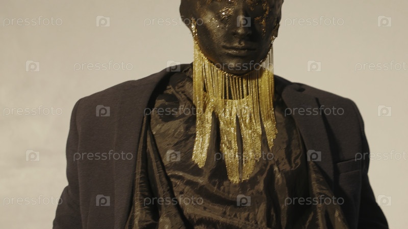 Современная статуя в музее. креативность. стильная скульптура с одеждой и ювелирными изделиями для модного музея. дизайнерские предметы и украшения на статуи в современном музее