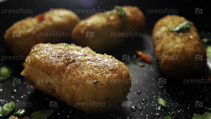 Процесс приготовления пищи - жарка мясных котлет с овощами в горячих сковородках