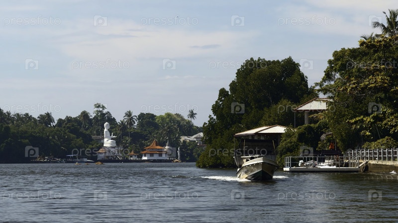 Красивая речная прогулка с тропической деревней. Действие. Речные лодки, плавающие среди джунглей и поселений. Река с деревней и статуей Будды в джунглях в солнечный летний день