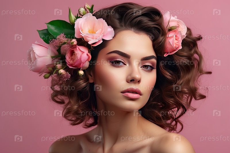 Брюнетка с локонами и пастельно-розовой цветочной короной, розовый фон, весенняя цветовая красота, романтическая женственность, 8 марта, женский день
