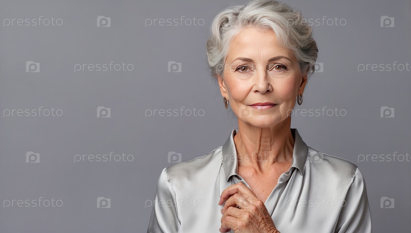 Пожилая женщина с серебряными волосами в блестящей блузке, уверенно позирующая в студии, элегантный стиль, зрелая красота, позитивное старение, изящная гордость