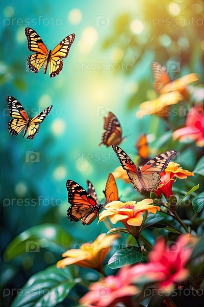 Тропические бабочки и коралловые цветы, зеленый летний фон, пустая зона для вдохновляющего сообщения или рекламного текста