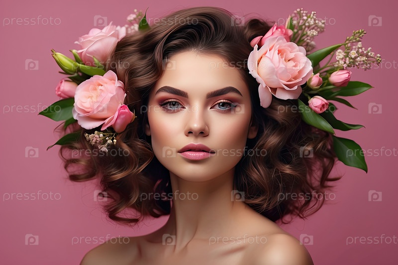 Брюнетка с объемными волосами и розово-зеленой цветочной короной, портрет весенней красоты, цветовая женственность, романтика, 8 марта, женский день